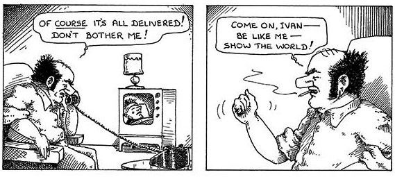 Reid is an inarticulate, violent, rampaging brute, but has a soft spot for his favourite TV soap opera, The Dangers of Ivan. It is appointment viewing and our hero Reid regularly skips work to watch it. At one point, Ivan has a terrible accident while driving, spends 6 years in a coma, (Reid watches every riveting second) and, upon awakening, falls to his death from an open window. The show continues with Ivan as a walking corpse, called The Horrors of Ivan. Reid fears the inevitability of his own death and he feels trapped by the mundane. “How many Mondays can there be in a man’s life?”