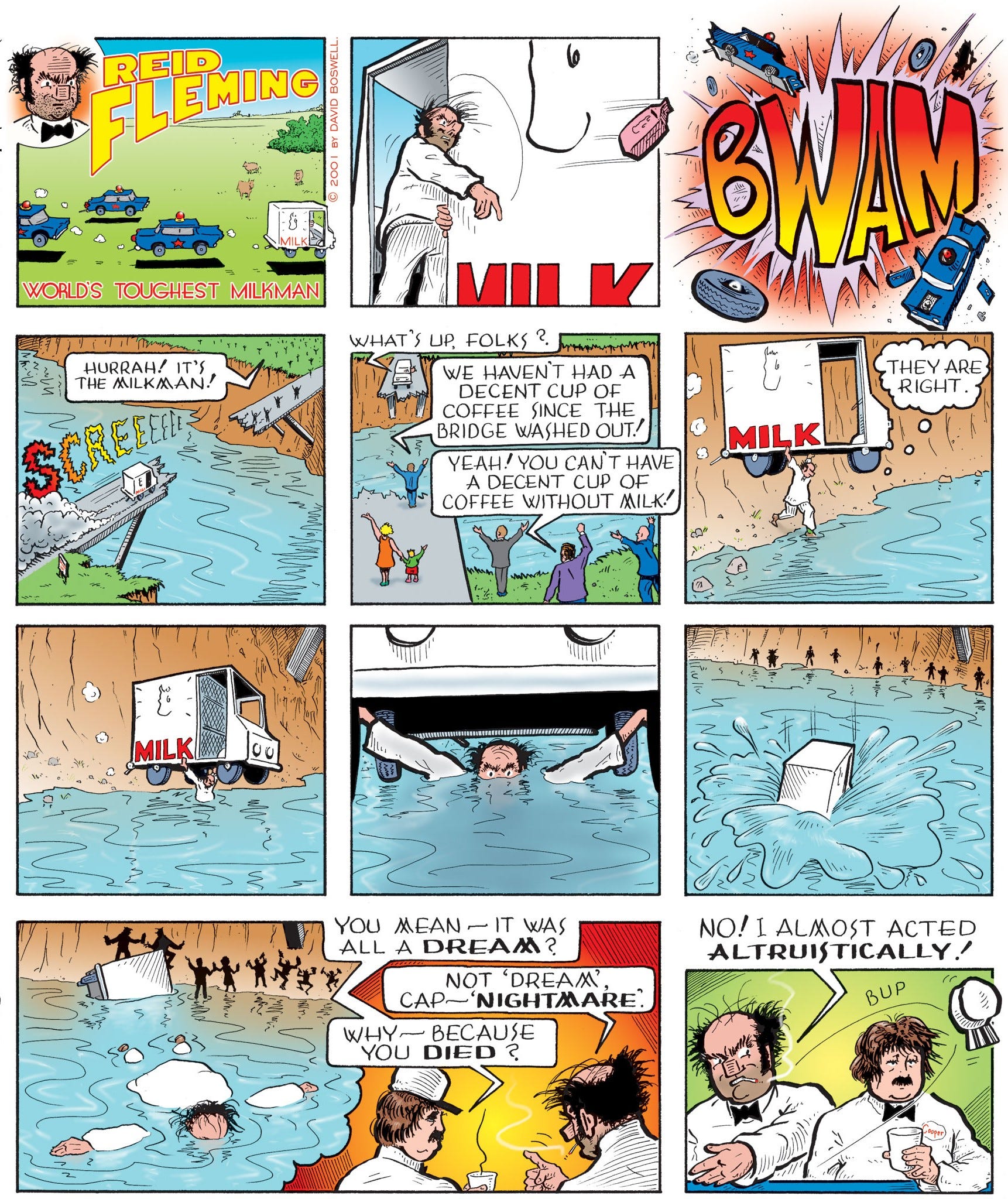 Meanwhile Boswell is still a broke cartoonist. In a time of Hollywood wish-fulfilment superheroes, I think the movie going public would love the reality check of Reid Fleming. David Boswell continues to deliver sporadic stories of the world’s toughest milkman. Hollywood, so far, has not.