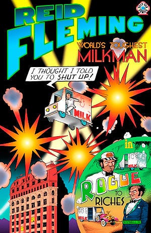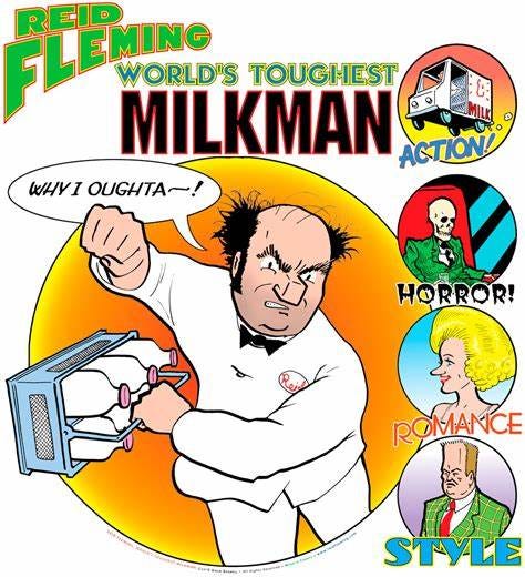 One of my favourites was Reid Fleming, the world’s toughest milkman. Written and illustrated by David Boswell. Boswell based the character on a childhood bully with the same name. Reid delivers his dairy products extremely aggressively, he has superhuman strength, is able to lift his milk truck with his bare hands, and has complete disregard for, well, everything. It’s laugh out loud material.
