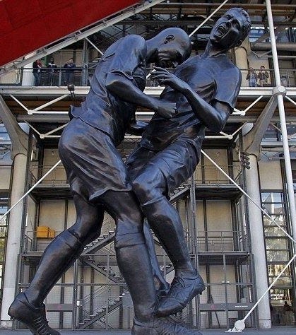 This crazy 5-meter-high sculpture in Paris depicts the moment when Zinedine Zidane headbutted Italian defender Marco Materazzi after he had verbally provoked him in the 110th minute of the 2006 World Cup Final between France and Italy. Zidane received a red card and was sent off. France lost the match, which was Zidane's last game as a professional. To this day no one knows what Marco said.